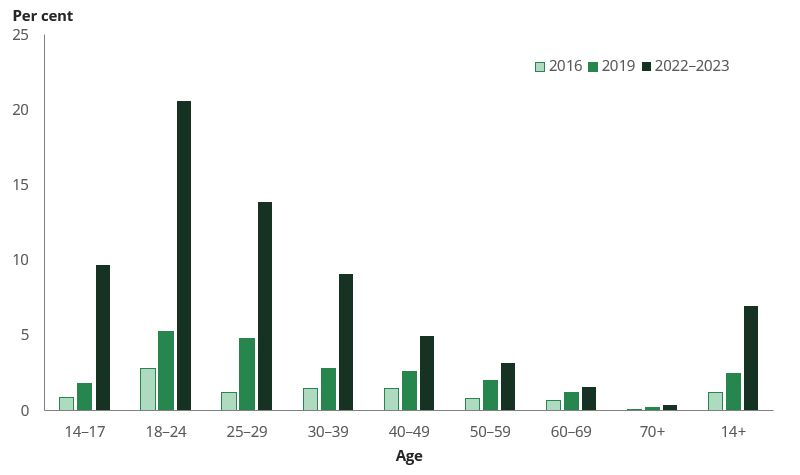 Current use of e‑cigarettes by age, 2016 to 2022–2023 | aihw.gov.au