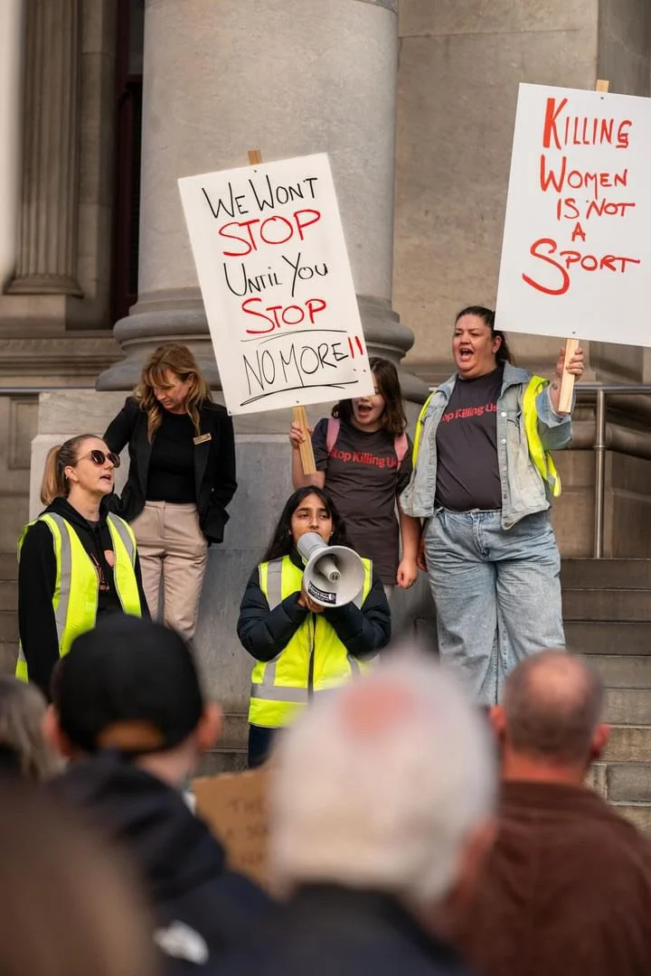 Sania Ali outside the Parliament of South Australia protesting against domestic violence.